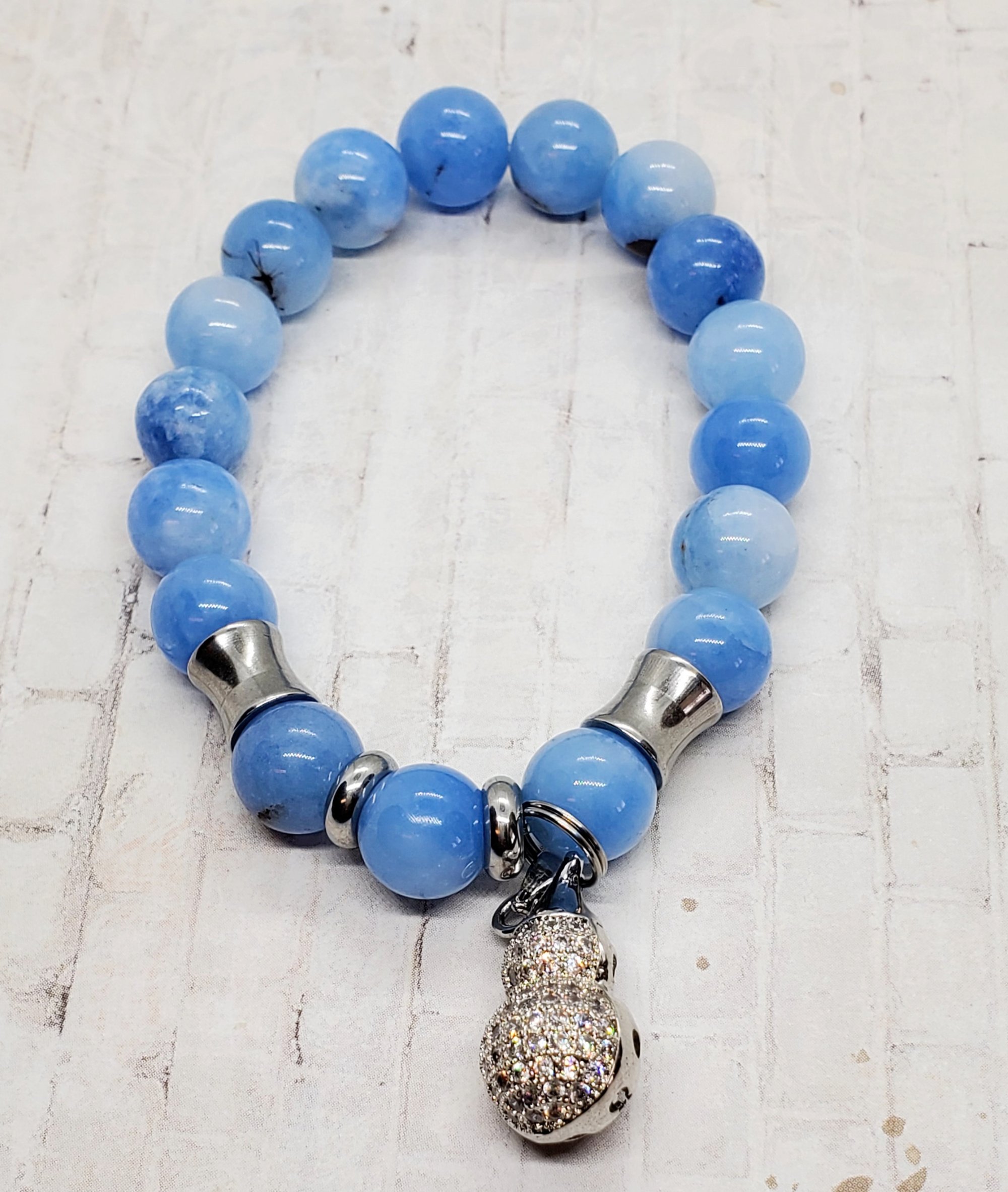 Natural blue gemstones with stainless steel spacer beads and pave charm..
