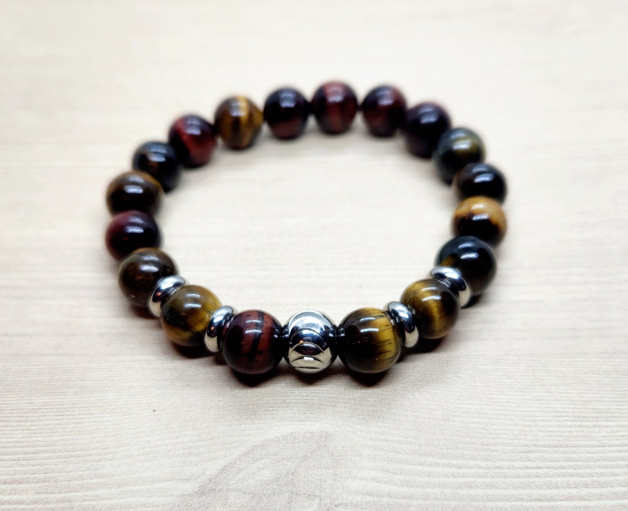 Tiger's Eye Bracelet accented with Stainless Steel focal and accent pieces, Excellent for stubbornness, creates a more positive and flexible attitude. Also said to give courage and strengthen convictions.