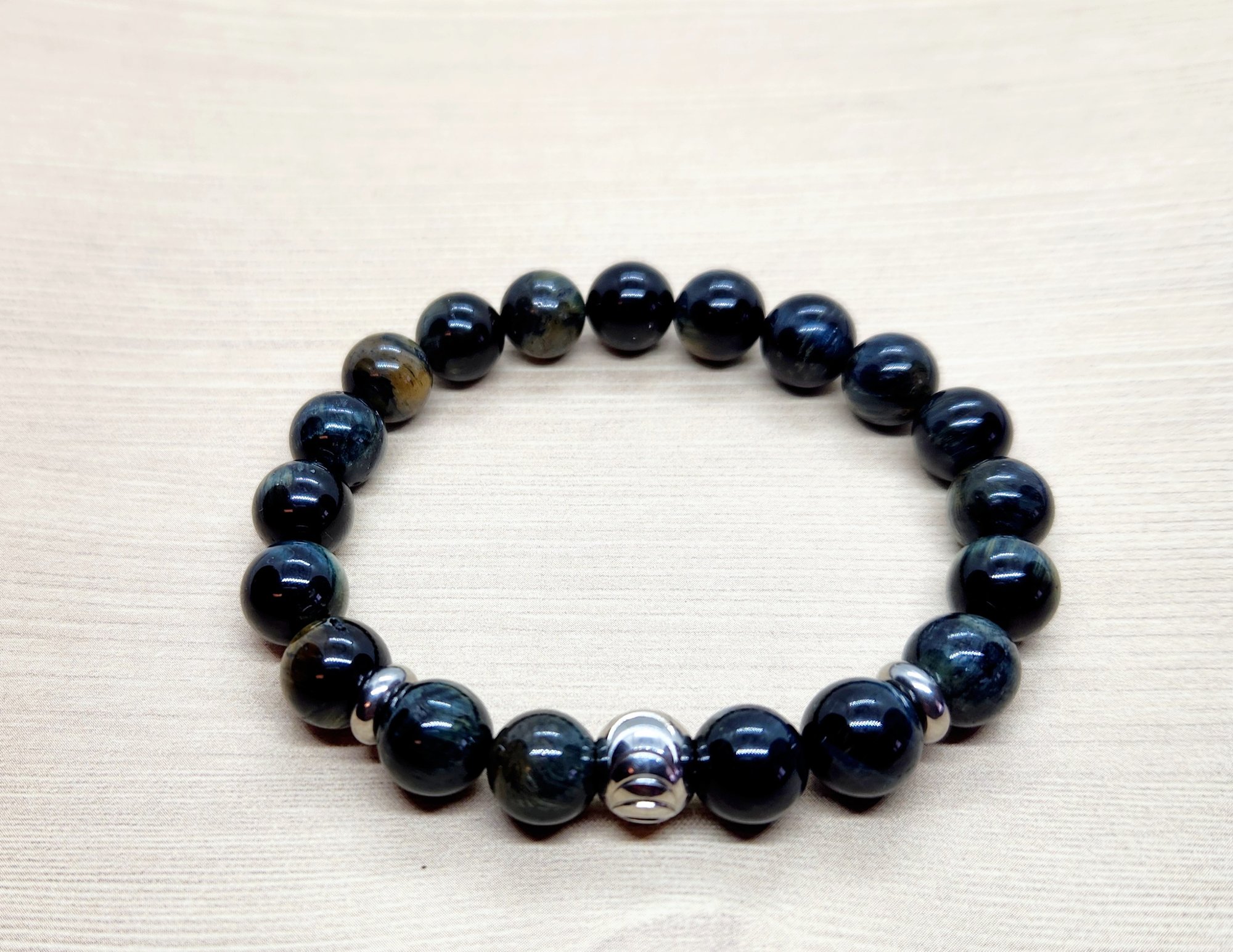 Bracelet accented with Stainless steel focal beads. Purported to be excellent for stubbornness, creates a more positive and flexible attitude. Also said to give courage and strengthen convictions. Bracelet is approx. 71/2 inches.