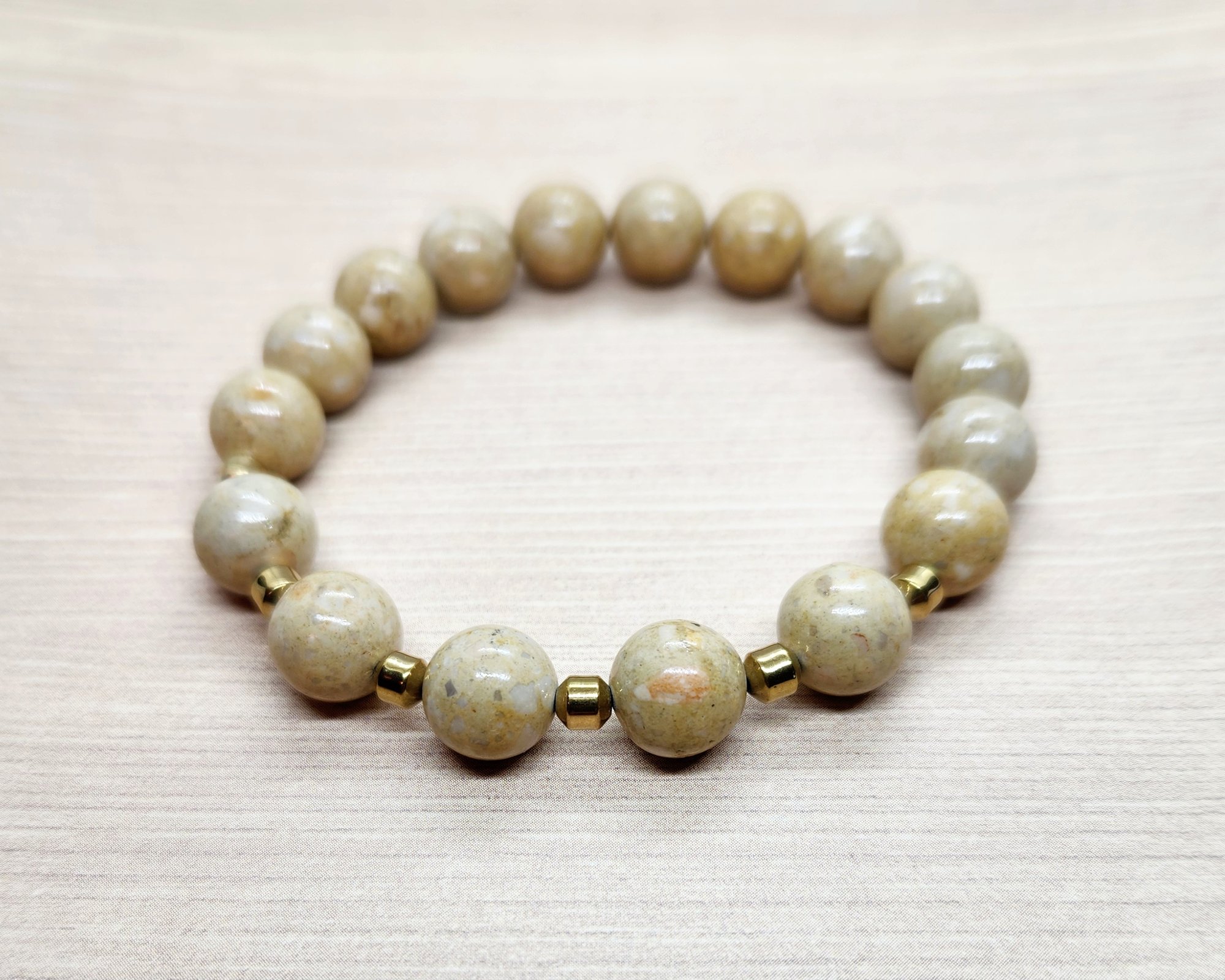 Light yellow jasper strengthens perseverance, provides stability, and improves grounding. Beads are accented by gold hematite beads, Fits up to 71/2 inches.