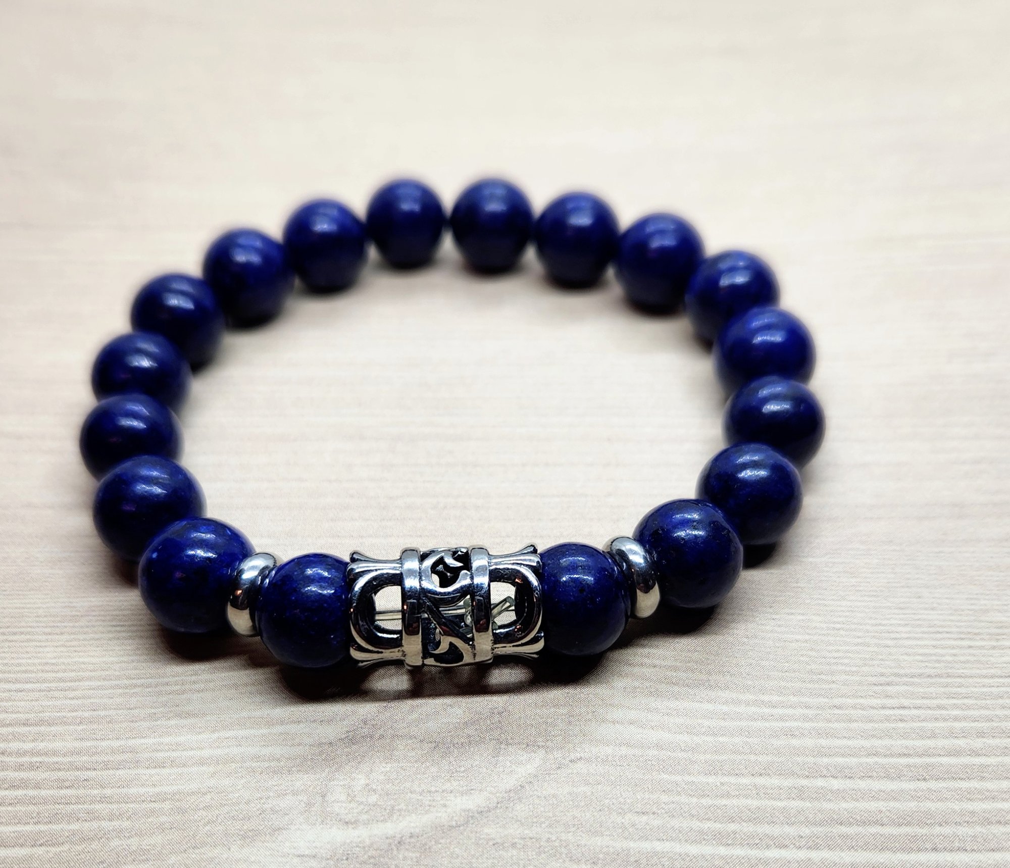 10mm Lapis Lazuli stones accented by stainless steel focal and spacer beads. Fits up to 71/2 wrist.
