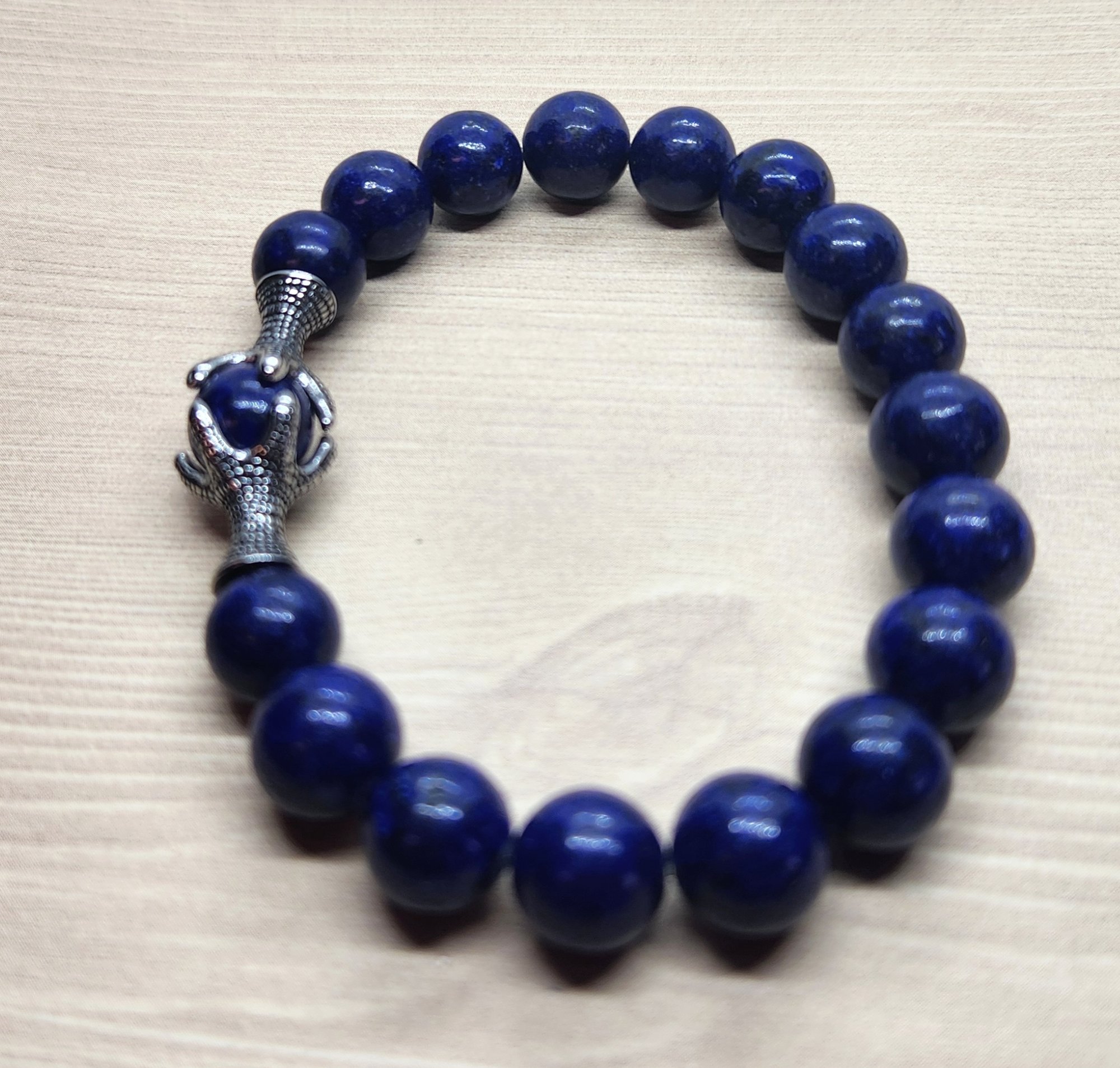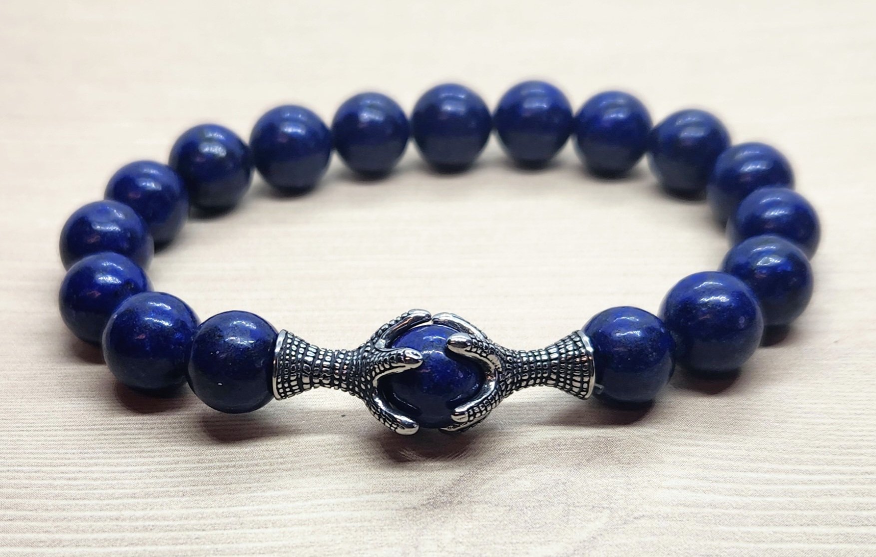 10mm Lapis Lazuli stones accented by stainless steel Claw foot spacer bead. Fits up to 71/2 wrist.