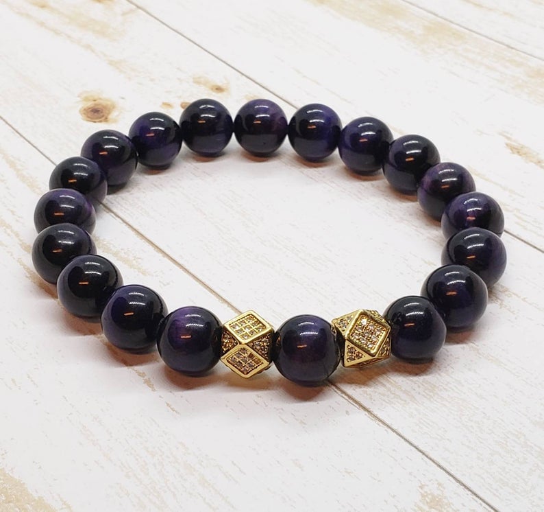 Purple Tiger's Eye gemstones beads accented by gold cz hexagon spacer beads. Excellent for stubbornness, creates a more positive and flexible attitude. Also said to give courage and strengthen convictions.