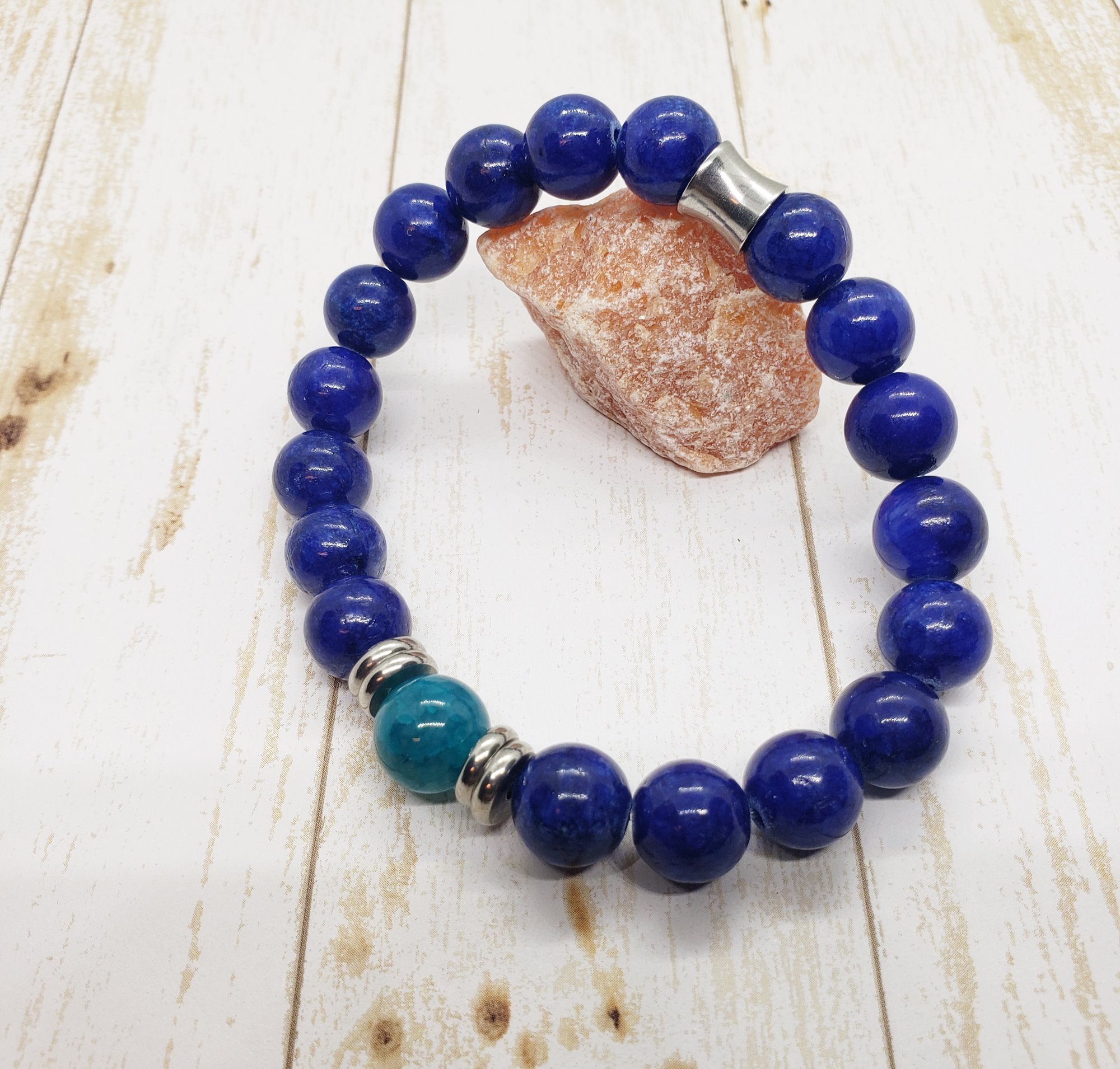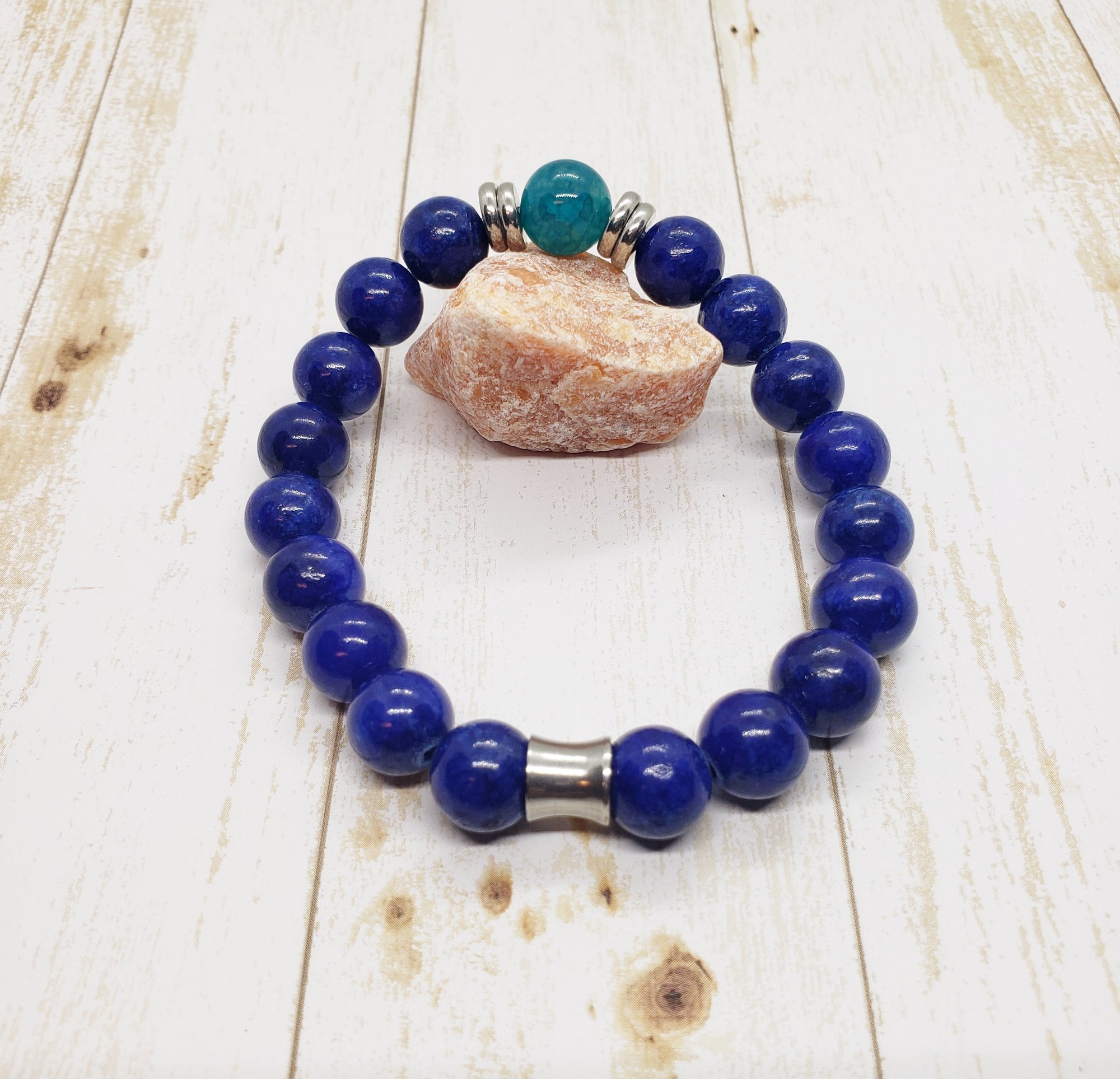 10 mm Blue Mountain Jade beaded bracelet accented by stainless steel focal beads.