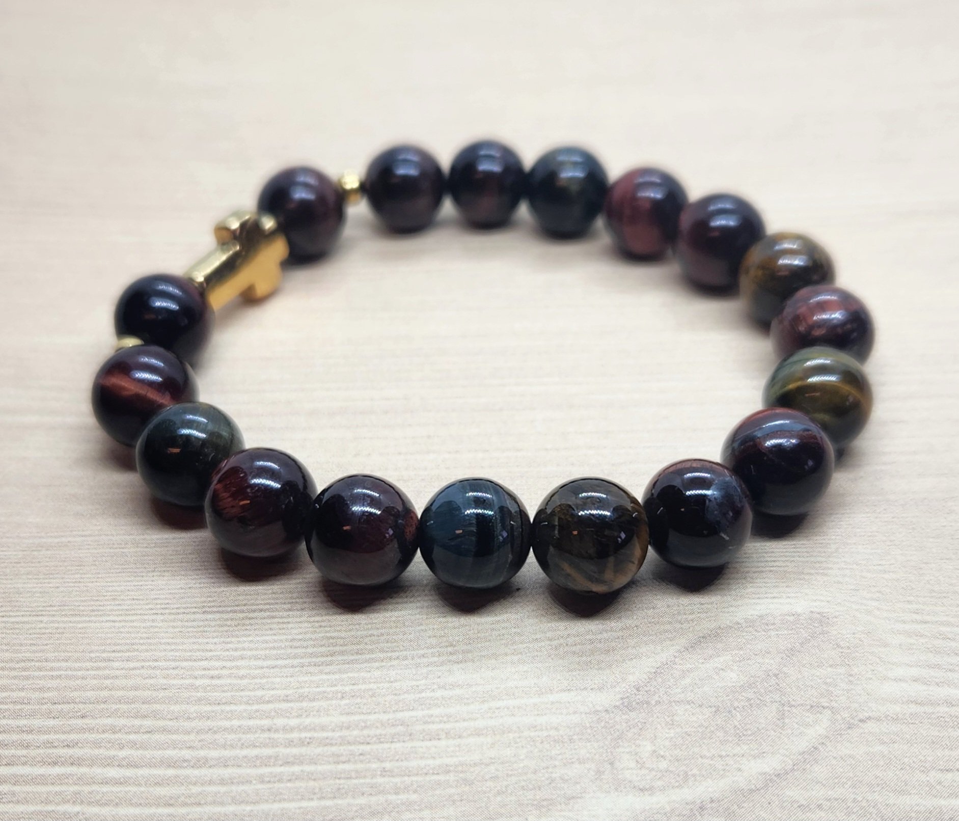 Multi colored Tiger's Eye Bracelet with Gold Stainless Steel Cross. Excellent for stubbornness, creates a more positive and flexible attitude. Also said to give courage and strengthen convictions.