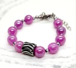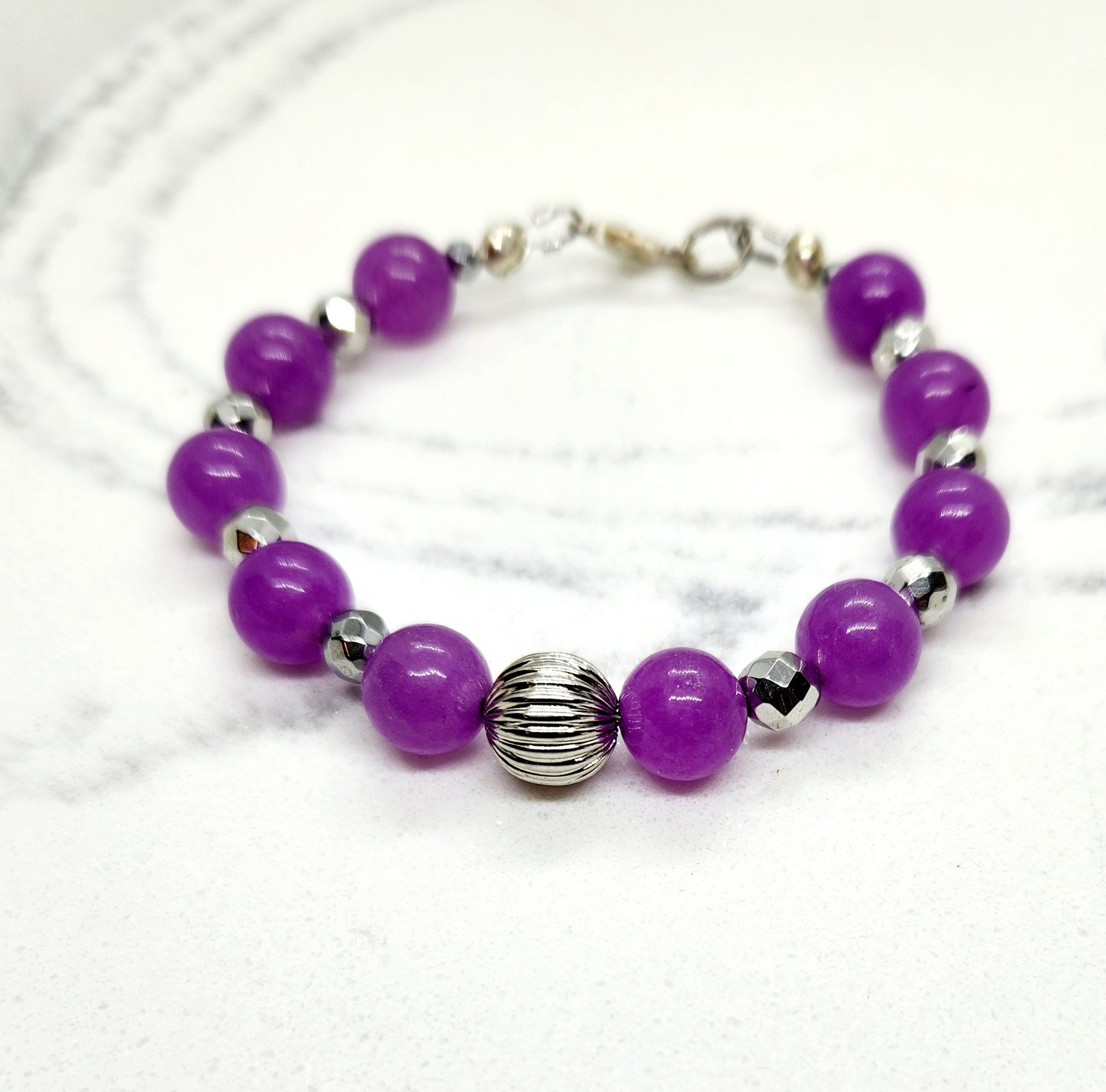 Violet/Berry Jade bracelet with stainless steel focal beads and silver hematite and or stainless steel spacer beads. Jade is known as a symbol of love and virtue and is said to strengthen the body and increase longevity. Fits up to 7 inches.